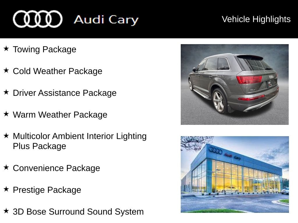 Samurai Gray Metallic 2019 Audi Q7 55 Prestige quattro 8-Speed Automatic with Tiptronic 3.0L TFSI V6 DOHC quattro Clean CARFAX. 3-Spoke Multifunction Steering Wheel w/Paddles, 3D Bose Surround Sound System, Audi Virtual Cockpit, Black Rubber All-Weather Floor Mats (Set of 4), Cold Weather Package, Convenience Package, Driver Assistance Package, Head-Up Display, Heated Rear Seats, LED Headlights w/Dynamic Indicators, Multicolor Ambient Interior Lighting Plus Package, Power Closing Doors, Prestige Package, Topview Camera System, Towing Package, Warm Weather Package, Wheels: 20" 10-Spoke-Star Design Bi-Color.