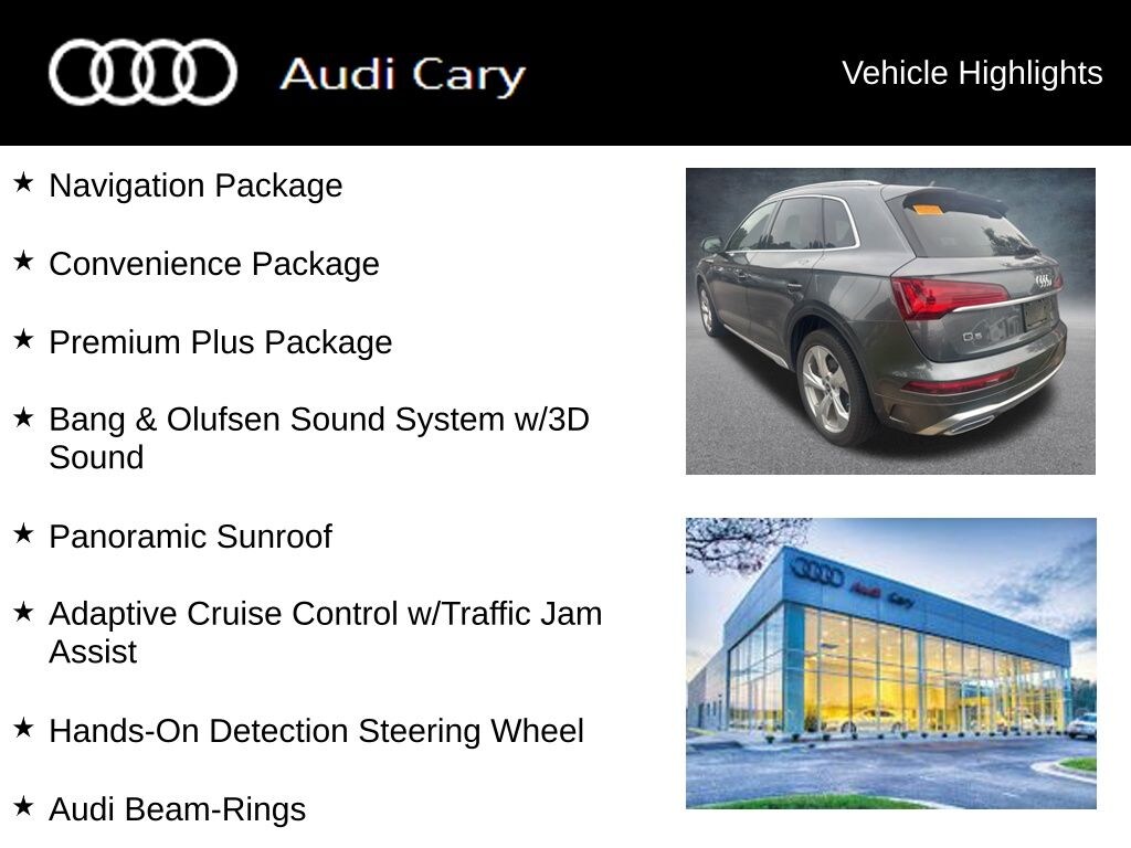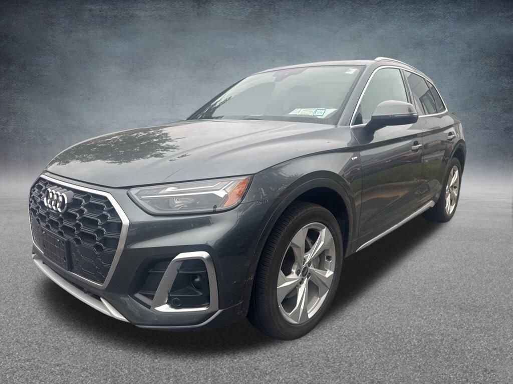 Daytona Gray Pearl Effect 2022 Audi Q5 45 S line Premium Plus quattro 7-Speed Automatic S tronic 2.0L Turbocharged quattro CARFAX One-Owner. Black w/Leather Seating Surfaces, Adaptive Cruise Control w/Traffic Jam Assist, Audi Active Lane Assist, Audi Beam-Rings, Audi Connect PRIME & PLUS, Audi Phone Box, Audi Virtual Cockpit Plus, Bang & Olufsen Sound System w/3D Sound, Convenience Package, Hands-On Detection Steering Wheel, Leatherette Covered Center Console & Door Armrests, MMI Navigation Plus, Navigation Package, Panoramic Sunroof, Power Adjustable Steering Column, Premium Plus Package, Top View Camera System, Wheels: 20" 5-Arm Design.