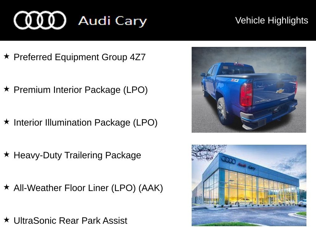 Kinetic Blue Metallic 2019 Chevrolet Colorado Z71 8-Speed Automatic V6 4WD CARFAX One-Owner. 4WD, All-Weather Floor Liner (LPO) (AAK), Heavy-Duty Trailering Package, Interior Illumination Package (LPO), Preferred Equipment Group 4Z7, Premium Interior Package (LPO), UltraSonic Rear Park Assist.