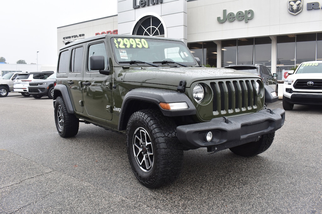 Clean CARFAX. Sarge Green Clearcoat 2021 Jeep Wrangler Unlimited Sport S 4WD 8-Speed Automatic 2.0L I4 DOHC 115V Auxiliary Power Outlet, 3.45 Rear Axle Ratio, 4-Wheel Disc Brakes, 7.0" Touchscreen Display, 8 Speakers, 8.4" Radio & Premium Audio Group, 8.4" Radio & Premium Audio Group (DISC), ABS brakes, Air Conditioning, Air Conditioning w/Auto Temperature Control, Air Filtering, Alpine Premium Audio System, AM/FM radio, Anti-Spin Differential Rear Axle, Apple CarPlay, Auto-Dimming Rear-View Mirror, Automatic Headlamps, Aux Battery, Brake assist, Cloth Low-Back Bucket Seats, Cluster 7.0" TFT Color Display, Cold Weather Group, Compass, Console Bin Task Light, Convenience Group, Deep Tint Sunscreen Windows, Delay-off headlights, Dual front impact airbags, Dual front side impact airbags, Electronic Stability Control, Emergency/Assistance Call, For More Info, Call 800-643-2112, Front 1-Touch Down Power Windows, Front anti-roll bar, Front fog lights, Google Android Auto, GPS Antenna Input, Heated Front Seats, Heated Steering Wheel, Integrated Center Stack Radio, Integrated roll-over protection, Leather Wrapped Steering Wheel, Low tire pressure warning, Manufacturer's Statement of Origin, Media Hub-2 USBS (Both Charge Only), MOPAR All-Weather Floor Mats (DISC), Normal Duty Suspension, Occupant sensing airbag, Outside temperature display, ParkView Rear Back-Up Camera, Power Heated Mirrors, Power steering, Power Top Quarter Window Storage Bag, Quick Order Package 22S Sport S, Radio data system, Radio: Uconnect 4 w/7" Display, Radio: Uconnect 4C Nav w/8.4" Display (DISC), Rear anti-roll bar, Rear Window Defroster, Remote Keyless Entry, Remote USB Port - Charge Only, Removable Rear Quarter Windows, Security Alarm, Selectable Tire Fill Alert, SiriusXM Satellite Radio, Sky 1-Touch Power Top, Speed control, Speed Sensitive Power Locks, Split folding rear seat, Sport S, Steering wheel mounted audio controls, Stop-Start Dual Battery System, Sun and Sound Package, Sun Visors w/Illuminated Vanity Mirrors, Tachometer, Technology Group, Technology Group (DISC), Telescoping steering wheel, Tilt steering wheel, Traction control, Trip computer, Universal Garage Door Opener, USB Host Flip, Variably intermittent wipers, Wheels: 17" x 7.5" Machined Granite Crystal, Wheels: 17" x 7.5" Tech Silver Aluminum.
